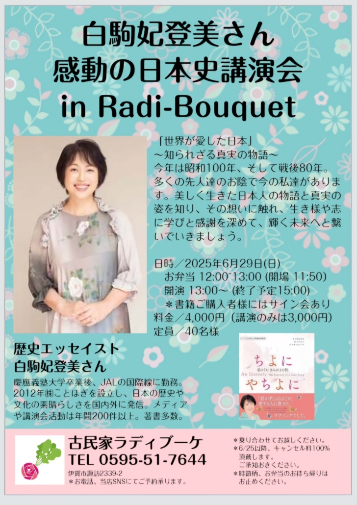6/29白駒妃登美さん「感動の日本史」講演会開催のお知らせ